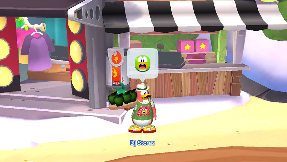 Apple Stores has finally found a buyer for his rotten stuff. However, he’s yet to figure out what was the cause of the tragedy. Heading back with a wheelbarrow of rotten apples, a potential suspect emerges at the Disney Shop. It seems like the apple industry on Club Penguin Island is going through some tough times. Maybe one day someone will find a use for rotten apples… rotten apple juice, anybody? No? Okay…