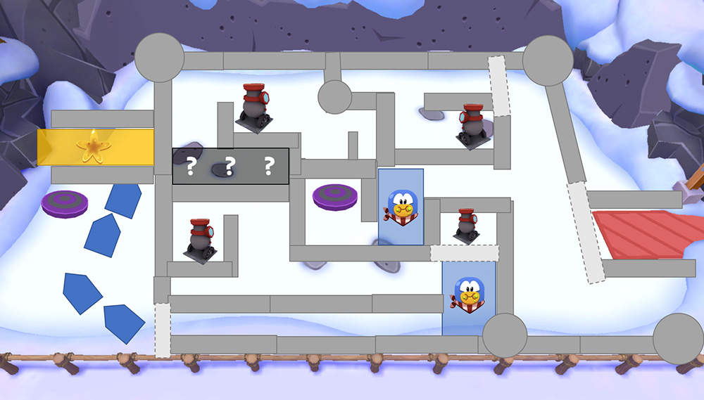 You would like to hope this is a simple maze, but I’m afraid it’s not. You see, it’s not only you who wants to recover the treasure. Aliens from the planet Upzar II would also like to get their alien hands… paws… claws… whatever they are… on the cheese grater’s stash of cash. In order to achieve this, they’ve setup a series of cannons and hovering “containment units” to stop penguins completing the maze. Those cheeky aliens.