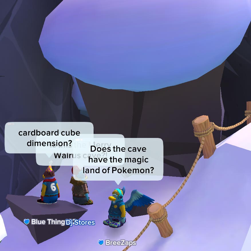 We waddled over to the right of the CPSN studio to discover a giant rock wall blocking a mysterious cave atop Mt. Blizzard. Blue Thing102, BreeZaps and I couldn’t find any clues at to who, or what, was residing in the secluded cave, so we came up with our own theories!