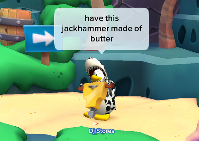 Finally, I needed butter. There’s no grocery stores on the Island so I was left to source fresh butter from a farm. I was going to place an order with Rockhopper, but knowing him he’d probably toot on it to turn it into stinky butter, which was NOT on my ingredients list. Suddenly, out of nowhere, a majestic sea shark-cow appeared.