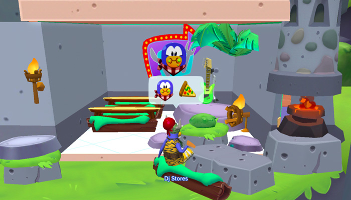 No matter the year, penguins (and dinosaurs!) love pizza. In the Fancy Plaza, time-travellers could visit Rocky’s Pizza for a slice of square pizza fresh from the lava oven. Seating was provided in the form of logs, and penguins could even help create pizza for themselves in the interactive kitchen area. Oh, and don’t forget to jam out on stage… I’ve heard caveguins enjoy rock music. ;) I’ve tried to re-create as much of this area as possible in my igloo, and I think I’ve done pretty well – it’s by far my favourite part of the igloo. Mmm… pizza…