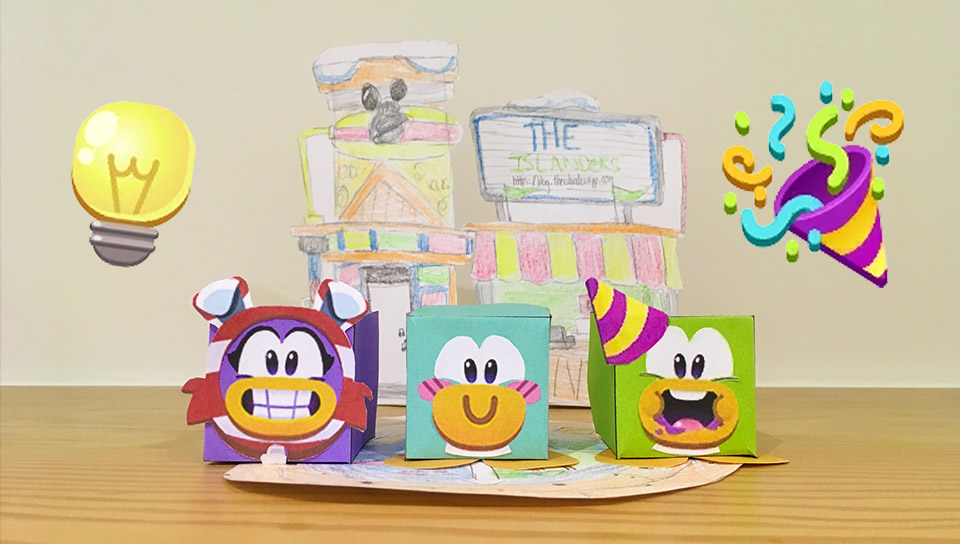 Making a stop-motion animation with my emoji cubes was so much fun and I thought it would be a great way to put my penguin emoji family to good use. I roughly sketched out and coloured in the Welcome Shop, Disney Shop and Welcome Plaza from Beacon Boardwalk and put them together to create a little set for my animation. I then used props like a Party Blaster and little orange bits of paper for “coins” in the animation. I’d love to see more penguins try creating an animation with their cubes, so I’m hosting a competition!